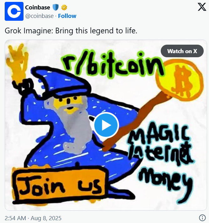 8월 8일(현지시간) 암호화폐 전문매체 유투데이에 따르면, 머스크는 코인베이스(Coinbase)의 공식 X 계정이 게시한 ‘비트코인 마법사’ 애니메이션을 리포스트하며 웃는 이모티콘으로 반응을 남겼다. 이 밈은 ‘매직 인터넷 머니(Magic Internet Money)’라는 문구와 함께 비트코인을 대표하는 OG 밈으로 널리 알려져 있다.