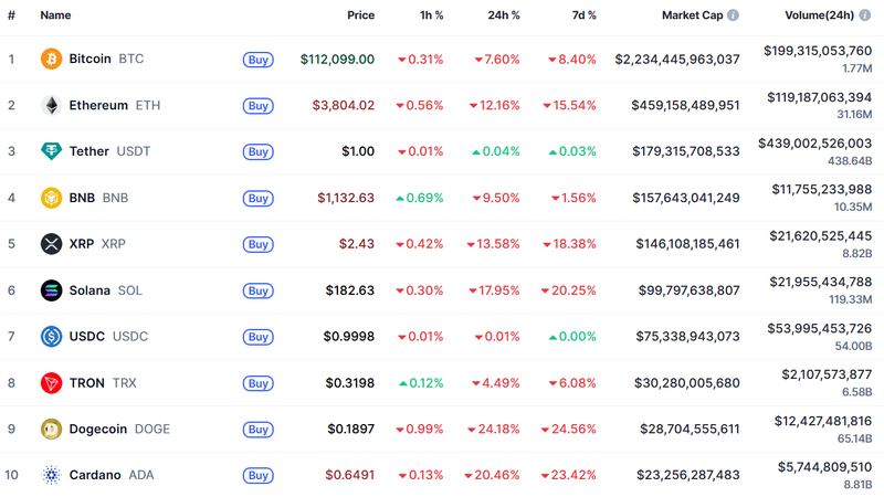 코인마켓캡에 따르면 비트코인은 7.6% 하락한 11만 2,099달러에 거래되고 있다. 이더리움은 12.16% 급락한 3,804달러, 솔라나는 17.95% 하락한 182.63달러로 낙폭이 특히 컸다. XRP는 13.58% 떨어진 2.43달러를 기록하고 있으며, 도지코인은 24.18%, 카르다노는 20.46% 각각 하락해 알트코인 전반의 낙폭이 두드러지고 있다.