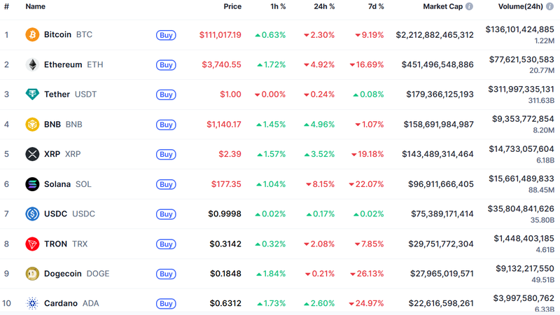 10월 12일(한국시간) 오전 7시 5분 현재 암호화폐 전문 시황 중계 사이트 코인마켓캡에 따르면, 비트코인(Bitcoin, BTC) 가격은 11만 1,017달러로 전일 대비 2.30% 하락하며 7일간 누적 낙폭도 9.19%를 기록했다. 이더리움은 3,740달러로 하루 만에 4.92% 떨어지며 주간 낙폭이 16.69%까지 확대됐다.