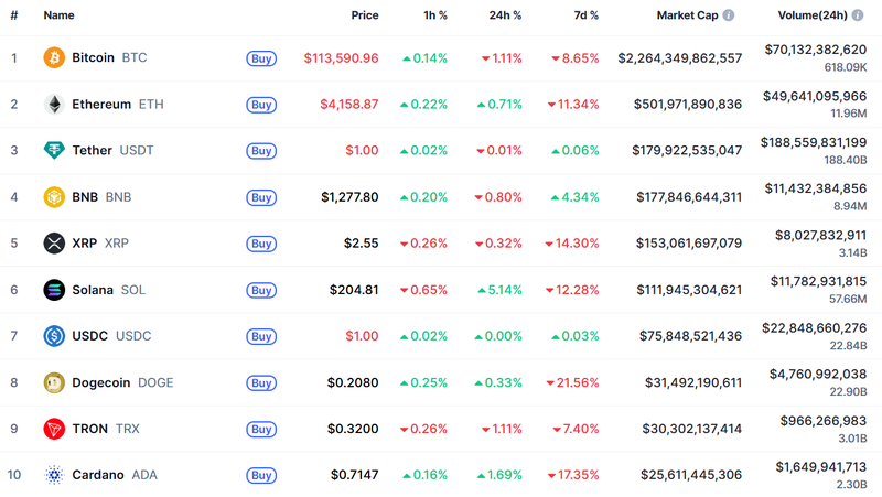 10월 14일(한국시간) 오후 1시 25분 현재 암호화폐 시황 중계 사이트 코인마켓캡에 따르면, 비트코인(Bitcoin, BTC)은 전일 대비 1.11% 하락한 11만 3,590달러에 거래되고 있다. 이더리움(Ethereum, ETH)은 0.71% 상승한 4,158달러를 기록했으나 주간 기준으로는 11.34% 하락했다. XRP는 2.55달러로 24시간 동안 0.32% 하락했고, 솔라나(Solana, SOL)는 204.81달러로 5.14% 상승했으나 주간 낙폭은 12.28%에 달했다.