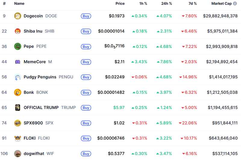 오전 5시 50분 현재 기준 암호화폐 전문매체 코인마켓캡에 따르면, 도지코인은 0.1973달러로 24시간 전보다 4.07% 상승했다. 시바이누(Shiba Inu, SHIB)는 2.31% 오른 0.00001014달러, 페페(Pepe, PEPE)는 4.68% 오른 0.000057116달러를 기록했다. 밈코어(MemeCore, M)는 7.86% 상승해 밈 코인 중 가장 높은 상승률을 나타냈으며, 펏지펭귄(Pudgy Penguins, PENGU)과 봉크(Bonk, BONK), 플로키(Floki, FLOKI), 도그위프햇(Dogwifhat, WIF) 등도 3~5%대 오름세를 보였다.