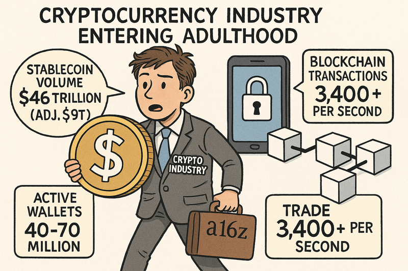 앤드리슨 호로위츠(a16z)는 2025년 암호화폐 현황 보고서를 통해 산업이 청소년기를 지나 성인기로 접어들고 있다고 평가했다. 보고서에 따르면 스테이블코인 연간 거래량은 46조 달러(조정치 9조 달러)에 달했으며, 월간 활성 암호화폐 지갑 사용자는 4,000만 명에서 7,000만 명 사이로 집계됐다. 또한 현재 블록체인 네트워크들은 초당 3,400건 이상의 거래를 처리하고 있는 것으로 나타났다.