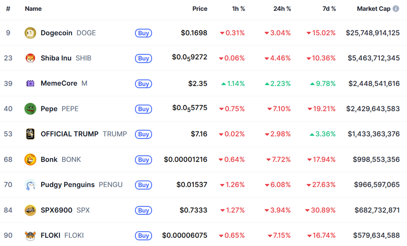 한국시간 11월 4일 오후 1시 50분 기준 코인마켓캡 데이터에 따르면, 도지코인은 0.1698달러로 24시간 기준 3.04%, 최근 7일 기준 15.02% 하락했다. 시바이누는 0.00009272달러로 하루 4.46%, 주간 10.36% 급락하며 약세장을 피하지 못했다. 페페는 0.00055775달러로 24시간 7.10% 하락했고, 일주일간 19.21% 하락해 낙폭이 더 컸다. 이 외에도 봉크(Bonk)는 7.72% 하락했으며, 플로키(Floki) 역시 7.15% 내렸고, 펏지펭귄(Pudgy Penguins)은 최근 일주일간 27.63% 폭락해 투자자 불안을 키웠다.