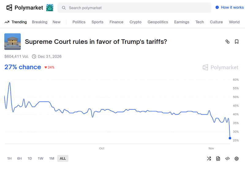 11월 5일(현지시간) 암호화폐 전문매체 코인게이프에 따르면, 미국 연방대법원 심리에서 트럼프 대통령의 긴급 권한을 통한 광범위한 관세 부과 방식의 합법성이 도마 위에 오르자, 폴리마켓(Polymarket) 트레이더들이 트럼프 관세 승소 확률을 하루 만에 27% 낮췄다. 같은 시기 비트코인(Bitcoin, BTC)은 약 9만 9,500달러 저점을 찍은 뒤 반등해 10만 3,000달러를 돌파했다.