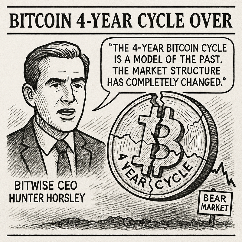 비트코인(BTC) 현물 ETF 발행사 비트와이즈(Bitwise) CEO 헌터 호슬리(Hunter Horsley)가 비트코인의 4년 사이클이 더이상 유효하지 않다고 밝혔다. 그는 X를 통해 "비트코인 4년 사이클은 과거의 모델이다. 현물 ETF 출시와 새 행정부가 출범한 이후 시장 구조가 완전히 바뀌었다. 이제 전혀 다른 참여자, 다른 매매 동기, 다른 유동성 메커니즘이 시장을 움직이고 있다"고 설명했다. 이어 “지난 6개월은 사실상 약세장이었으며, 현재는 거의 끝자락에 와 있다”고 덧붙였다.