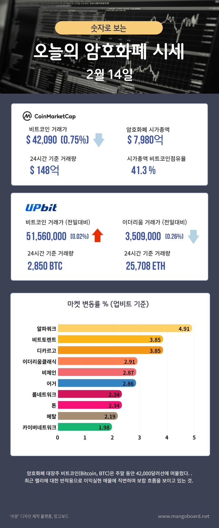 2월 14일(한국시간) 오전 10시 10분 기준 현재 코인마켓캡 기준으로 글로벌 비트코인(BTC, 시총 1위) 가격은 24시간 전 대비 0.73% 하락한 42,098달러를 기록 중이다. 시가총액은 7,980억 달러이며, 도미넌스(시총 비중)는 41.3%이다.