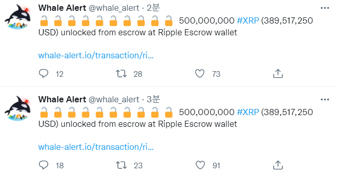 3월 1일(현지시간) 암호화폐 트랜잭션 추적 사이트 웨일 알러트(Whale Alert)에 따르면에 따르면, ripple escrow wallet의 주소 rh2EsAe2xVE71ZBjx7oEL2zpD4zmSs3sY9와 ripple escrow wallet의 주소 rfWPPQBYqYmoFMdVnjzXCagJbz5uajSBXL 에서 각각 5억 XRP가 락업 해제됐다. 이날 오전 9시 10분 현재 코인마켓캡 기준 리플(XRP, 시총 6위) 가격은 24시간 전 대비 9% 급등한 0.7853달러를 기록 중이다.