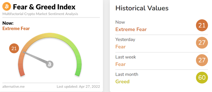 비트코인의 투자심리도 다시 얼어붙었다. 4월 27일(한국시간) 암호화폐 데이터 제공 업체 알터너티브(Alternative)의 자체 추산 '크립토 공포·탐욕 지수'에 따르면 해당 지수는 전날보다 6 포인트 내린 21을 기록했다. 투심이 악화되며 공포 단계에서 극단적 공포 단계로 전환됐다.