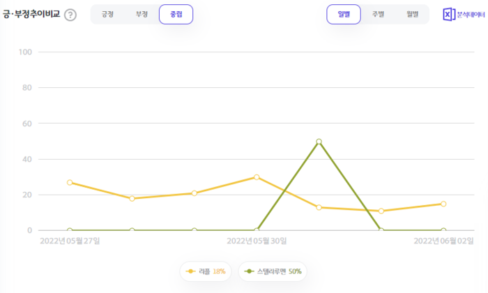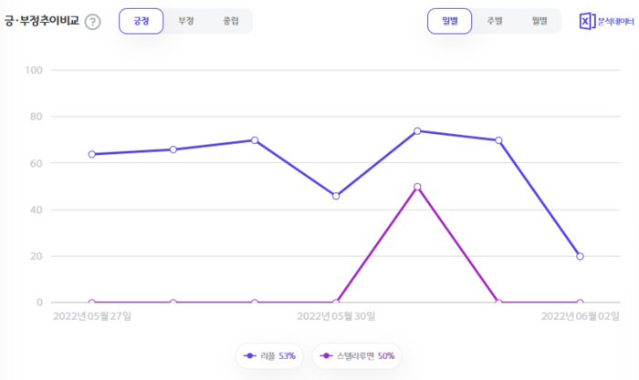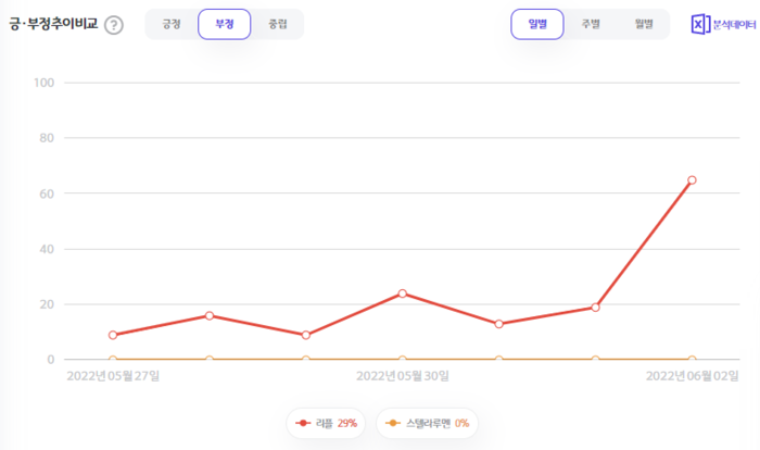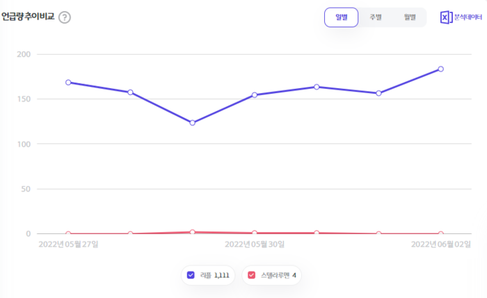 5월 27일부터 6월 2일까지 일주일간 리플은 1,111회, 스텔라루멘은 4회 언급됐다.