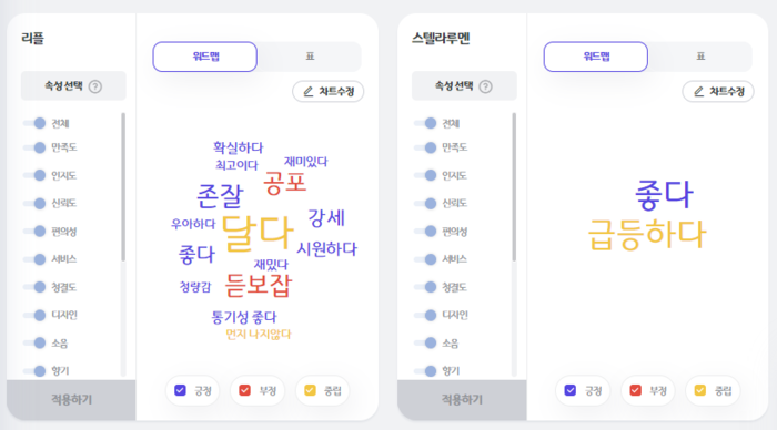 리플의 이미지는 긍정 53%, 부정 29%, 중립 18%로, 긍정적인 이미지를 보유한 것으로 확인됐다. 주요 감성어 중, 긍정적인 표현은 ‘존잘’, ‘강세’, ‘좋다’, ’시원하다’, ‘재밌다’, ‘통기성 좋다’, ‘확실하다’, ‘최고이다’ 등이 있다. 부정적인 표현은 ‘듣보잡’과 ‘공포’가 있으며, 중립적인 표현은 ‘달다’와 ‘먼지 나지않다’가 있다.