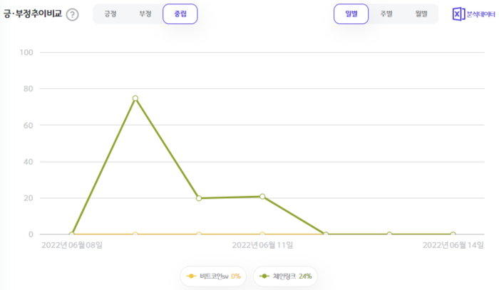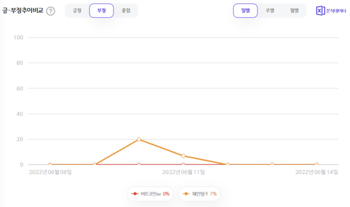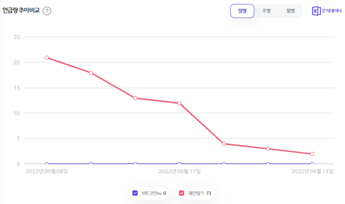 6월 8일부터 6월 14일까지 일주일간 비트코인SV는 0회, 체인링크는 73회 언급됐다.