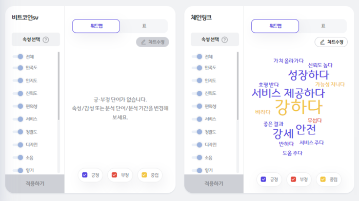 체인링크의 이미지는 긍정 69%, 부정 7%, 중립 24%로, 긍정적인 이미지를 지닌 것으로 나타났다. 주요 감성어 중, 긍정적인 표현은 ‘성장하다’, ‘서비스 제공하다’, ‘강세’, ‘안전’, ‘반하다’, ‘도움 주다’, ‘좋은 결과’, ‘호평 받다’, ‘신뢰도 높다’, ‘가치 올라가다’ 등이 있다. 부정적인 표현은 ‘무섭다’ 단 하나이며, 중립적인 표현은 ‘강하다’, ‘바라다’, ‘가능성 지니다’ 등이 있다.