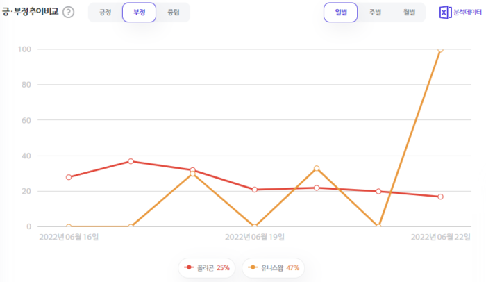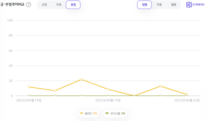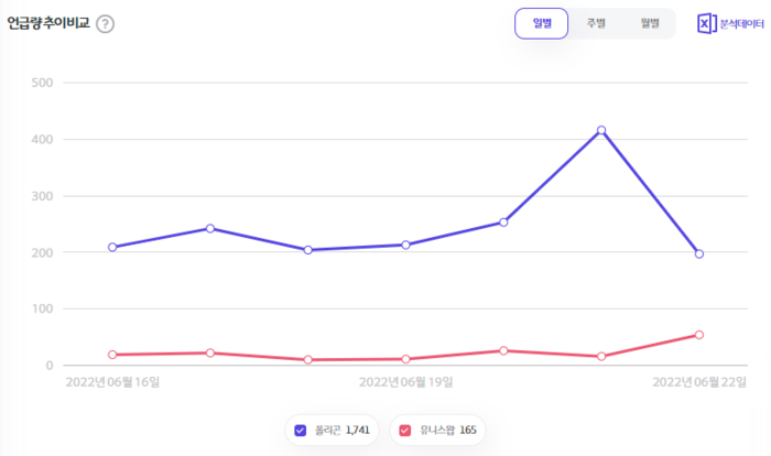 6월 16일부터 6월 22일까지 일주일간 폴리곤은 1,741회, 유니스왑은 165회 언급됐다.