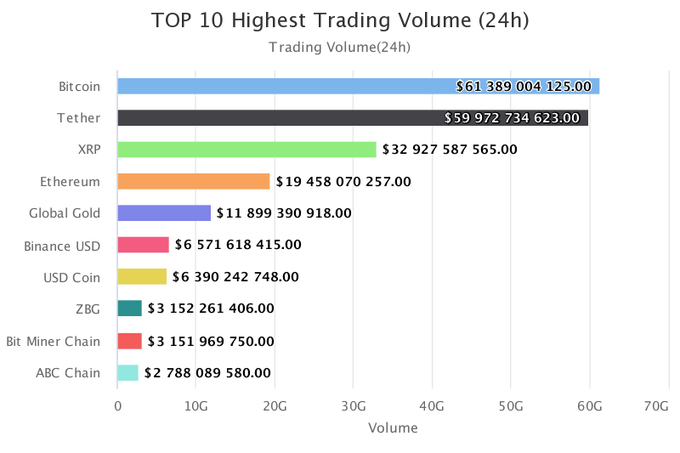 22일(현지시간) 암호화폐 마켓 데이터 플랫폼 코인트렌즈(CoinTrendz)닷컴의 트위터에 따르면, 지난 24시간 동안 거래량이 가장 많은 암호화폐는 비트코인(BTC, 약 614억 달러)로 나타났다. 이어 테더(USDT, 약 600억 달러), 리플(XRP, 약 329억 달러), 이더리움(ETH, 약 195억 달러)이 각각 2~4위를 차지했다.