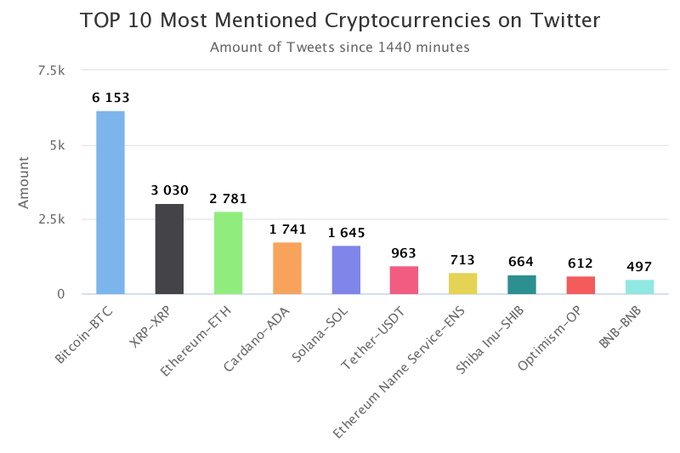 8월 5일(현지시간) 암호화폐 마켓 데이터 플랫폼 코인트렌즈(CoinTrendz)닷컴의 트위터에 따르면, 지난 24시간 동안 트위터에서 가장 많이 언급된 암호화폐는 비트코인(BTC, 6153회)으로 나타났다. 이어 리플(XRP, 3030회), 이더리움(ETH, 2781회), 카르다노 에이다(ADA, 1741회)가 각각 2~4위를 차지했다. 5위~10위에는 솔라나(SOL, 1645회), 테더(USDT, 963회), 이더리움 네임 서비스(ENS, 713회), 시바이누(SHIB, 664회), 옵티미즘(OP, 612회), 바이낸스코인(BNB, 497회)가 순서대로 이름을 올렸다.