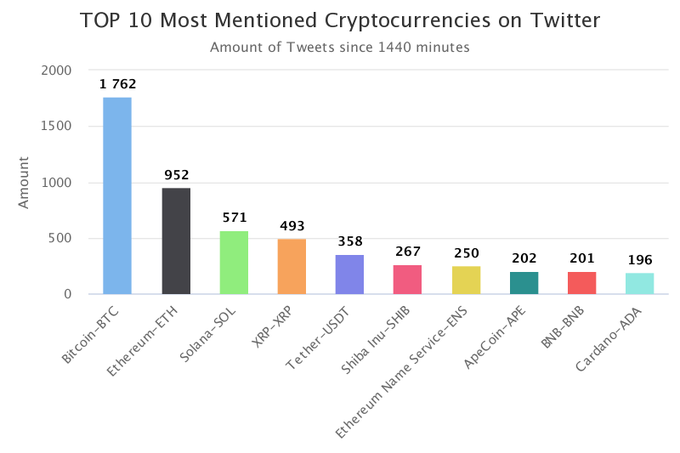 8월 6일(현지시간) 암호화폐 마켓 데이터 플랫폼 코인트렌즈(CoinTrendz)닷컴의 트위터에 따르면, 지난 24시간 동안 트위터에서 가장 많이 언급된 암호화폐는 비트코인(BTC, 1762회)으로 나타났다. 이어 이더리움(ETH, 952회), 솔라나(SOL, 571회), 리플(XRP, 493회)이 각각 2~4위를 차지했다. 5위~10위에는 테더(USDT, 358회), 시바이누(SHIB, 267회), 이더리움 네임 서비스(ENS, 250회), 에이프코인(APE, 202회), 바이낸스코인(BNB, 201회), 카르다노 에이다(ADA, 196회)가 순서대로 이름을 올렸다.