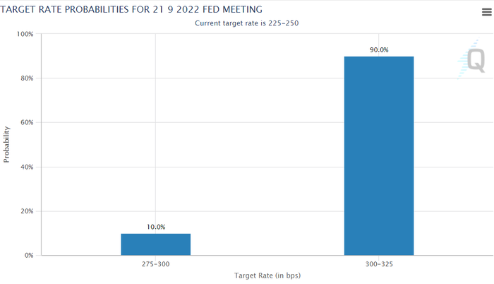 9월 9일(현지시간) 시카고상품거래소(CME) 그룹의 페드워치에 따르면 이날 오전 5시 16분(미국 중부 표준시 기준) 현재 미 연방준비제도(Fed·연준)가 9월 20~21일 열리는 공개시장위원회(FOMC) 회의에서 기준금리를 50bp(0.50%포인트, 1bp=0.01%포인트) 인상할 확률은 10.0%에 그쳤다. 반면 75bp 금리 인상 가능성은 90.0%에 달했다. 100bp 인상 가능성은 0%로 점쳐지고 있다. 현재 미국 기준금리는 2.25~2.50% 수준이다. 전날 파월 의장은 연준이 인플레이션을 낮추는 데 전념하고 있다며 인플레이션이 내려갈 때까지 금리 인상을 지속할 것이라는 점을 강조했다. 연준 내 대표적인 매파 인사로 꼽히는 제임스 불러드 세인트루이스 연은 총재도 노동시장이 탄탄하다는 점을 확인했다며 다음 회의에서 0.75%포인트 금리 인상으로 기울어졌다고 말했다. 크리스토퍼 월러 연준 이사도 다음 회의에서 큰 폭의 금리 인상을 지지한다고 언급하면서 9월 0.75%포인트 금리 인상 가능성에 힘이 실렸다.