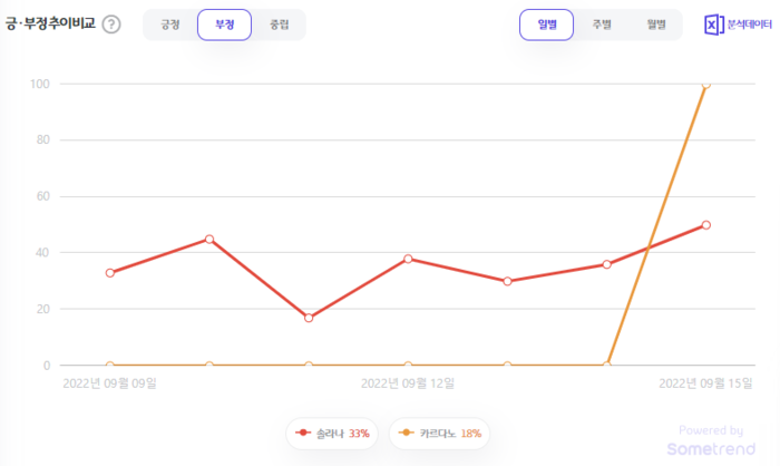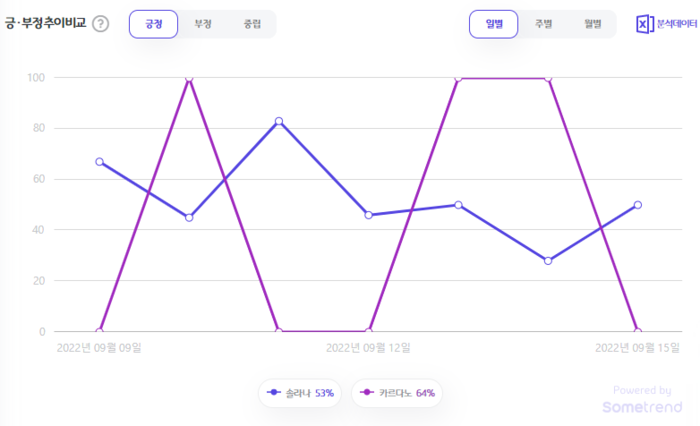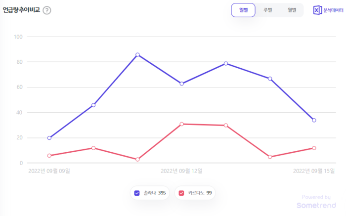 9월 9일부터 9월 15일까지 일주일간 솔라나는 395회, 카르다노는 99회 언급됐다.
