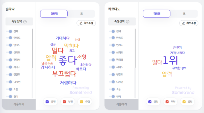 카르다노의 이미지는 긍정 64%, 부정 18%, 중립 18%로, 긍정적인 이미지를 지닌 것으로 나타났다. 주요 감성어 중, 긍정적인 표현은 ‘1위’와 ‘유익한 정보’, ‘가격 내리다’, ‘큰 인기’가 있다. 부정적인 표현은 ‘멀다’, ‘중립적인 표현은 ‘압력’이 있다.
