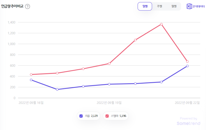 리플 vs 스텔라, 언급량 추이는? 9월 16일부터 9월 22일까지 일주일간 리플은 2,129회, 스텔라는 5,196회 언급됐다.