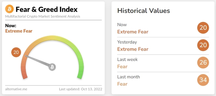 이날 암호화폐 데이터 제공 업체 얼터너티브(Alternative)의 자체 추산 '크립토 공포·탐욕 지수'에 따르면 해당 지수는 전날과 동일한 20를 기록하며 '극단적 공포' 단계가 지속됐다. 해당 지수는 0에 가까울수록 시장의 극단적 공포를 나타내며, 100에 가까울수록 극단적 낙관을 의미한다.