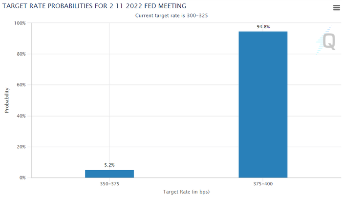 CME 페드워치 "11월 기준금리 75bp 인상 가능성 94.8%"...美 4연속 ‘자이언트스텝’ 기정사실화10월 18일(현지시간) 시카고상품거래소(CME) 그룹의 페드워치에 따르면 이날 오전 4시 11분(현지시간) 현재 미 연방준비제도(Fed·연준)가 11월 예정된 공개시장위원회(FOMC) 회의에서 기준금리를 75bp(0.75%포인트, 1bp=0.01%포인트) 인상할 확률은 94.8%에 달했다. 50bp 금리 인상 가능성은 5.2%에 불과했다. 100bp 인상 가능성은 0%로 점쳐지고 있다. 현재 미국의 기준금리는 3.00~3.25% 수준이다.