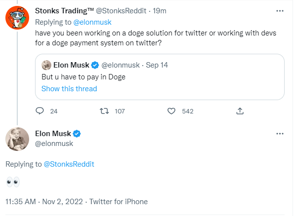 440억 달러를 주고 트위터를 최종 인수한 일론 머스크 테슬라 최고경영자(CEO)가 "트위터를 위한 도지 솔루션을 개발하거나 트위터에 도지 결제 시스템을 도입하기 위해 개발 중인가?"라는 트위터 유저 질문에 들여다보고 있다는 의미의 이모지(👀)로 답했다.