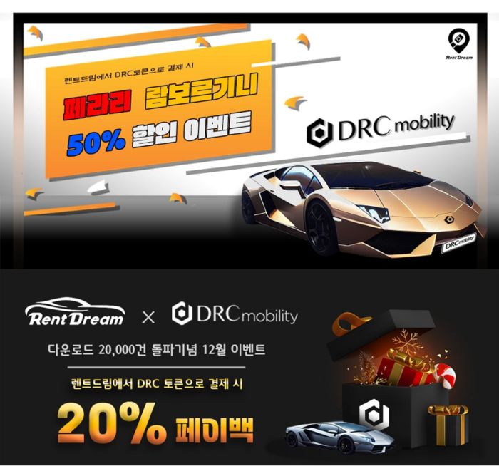 블록체인 기반 모빌리티 플랫폼 디알씨모빌리티(DRC)가 렌터카 플랫폼 카셰어링 서비스 ‘렌트드림’ 20,000건 돌파 기념 DRC 토큰 결제 이벤트를 진행한다고 밝혔다.