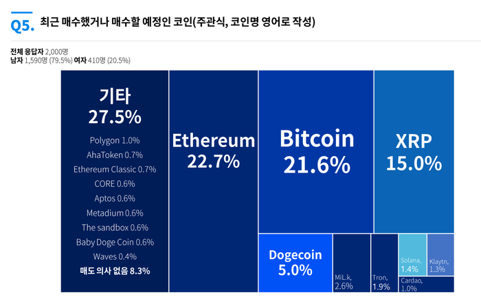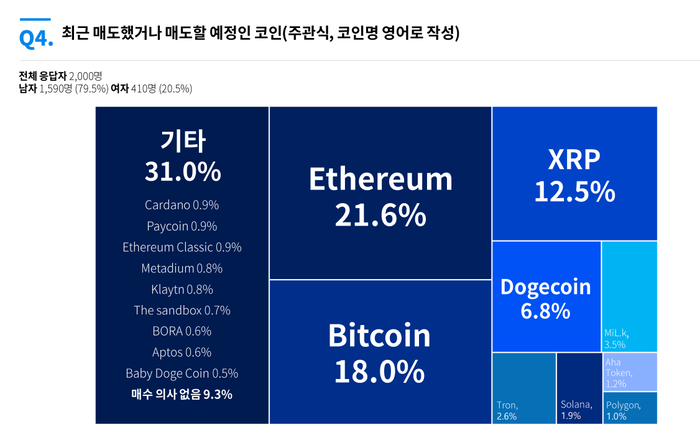 이번 주 매도 예정 암호화폐를 묻는 질문에 대해서는 이더리움, 비트코인, 리플, 도지코인, 밀크, 트론, 솔라나, 아하 폴리곤 순으로 많았다.