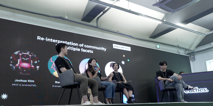 '함께 만들어나간다는 것, 커뮤니티의 다양한 해석' 세션에서 김성환 MMZ(람다256) 리드, 로니 이터널에디션즈(워터밤NFT) 커뮤니티 엠버서더, 호프 리 리파이코리아 설립자, 김재윤 슈퍼블록 대표가 ‘커뮤니티’를 어떻게 관리하고 발전시키고 있는지 의견을 공유했다.