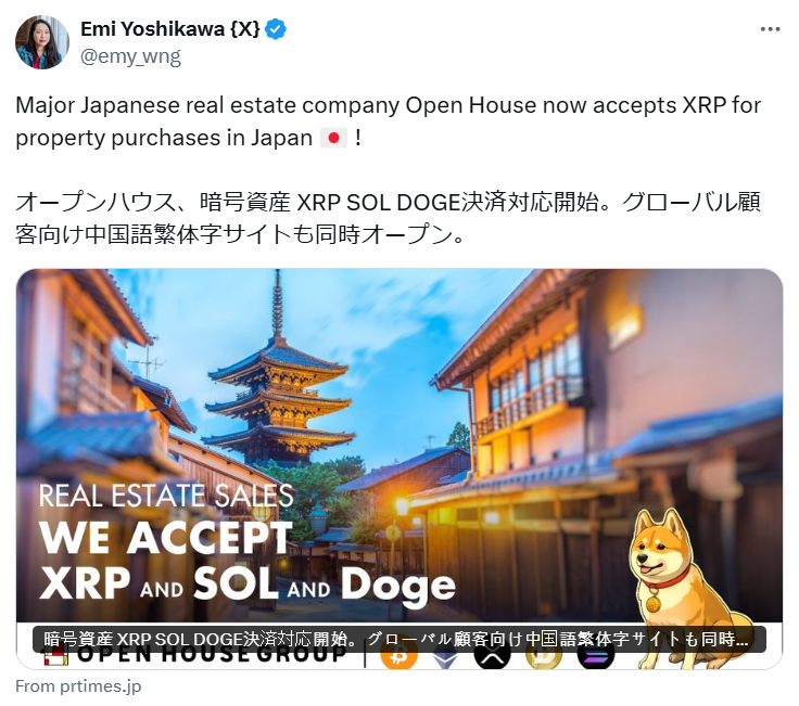 리플 전 부사장이자 업계 전문가인 요시카와 에미(Emi Yoshikawa)는 해당 소식을 전하며 "오픈하우스는 일본 부동산 시장에서 상당한 영향력을 지닌 대형 기업으로, 이번 XRP 결제 지원은 실질적인 채택 확산의 이정표가 될 수 있다"고 강조했다.