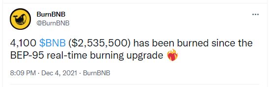바이낸스코인(BNB) 소각 데이터 추적 봇 번BNB에 따르면, 바이낸스 스마트 체인(BSC)이 BEP-95 거버넌스 제안 적용 후 BNB 누적 소각량이 4,100개를 돌파했다. 이는 약 253만 달러 규모다. 코인마켓캡 기준 BNB는 현재 14.40% 내린 533.80달러에 거래되고 있다.