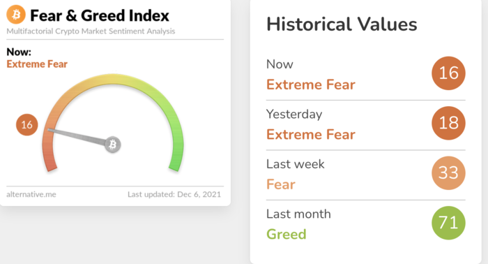 암호화폐 데이터 제공 업체 알터너티브(Alternative)의 자체 추산 '공포·탐욕 지수'가 전날보다 2 포인트 내린 16을 기록했다. 투심이 위축되며 극단적 공포 단계가 지속됐다. 해당 지수는 0에 가까울수록 시장의 극단적 공포를 나타내며, 100에 가까울수록 극단적 낙관을 의미한다. 공포 탐욕 지수는 변동성(25%), 거래량(25%), SNS 언급량(15%), 설문조사(15%), 비트코인 시총 비중(10%), 구글 검색량(10%) 등을 기준으로 산출된다.