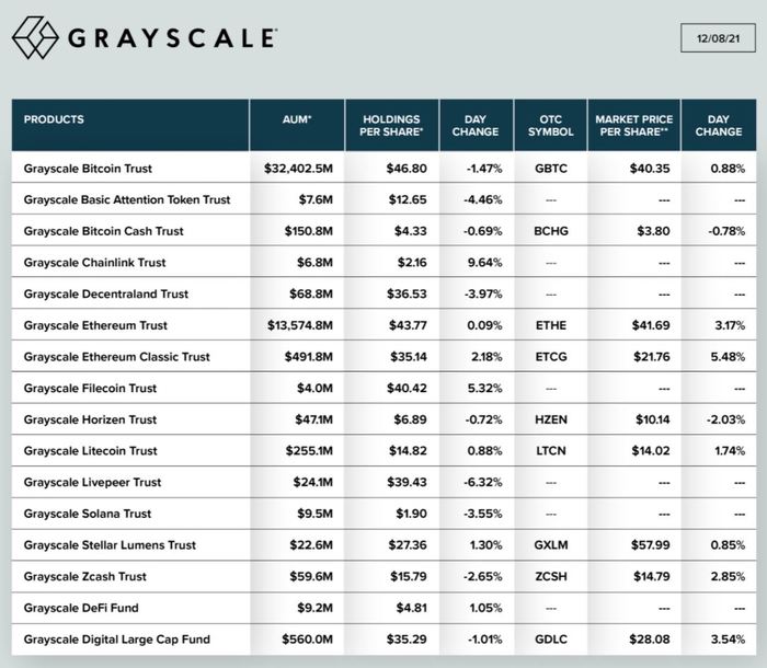 암호화폐 투자펀드 그레이스케일이 공식 트위터를 통해 12월 8일 기준 총 운용자산(AUM) 규모가 약 477억 달러를 기록했다고 밝혔다. 그레이스케일 비트코인 트러스트(GBTC) 판매 단위 가격은 전날 대비 0.88% 상승한 40.35 달러, 그레이스케일 이더리움신탁(ETHE)은 3.17% 상승한 41.69 달러에 거래되고 있다.