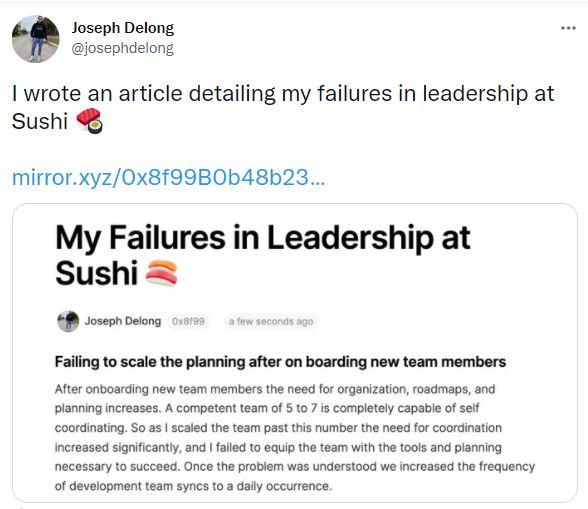 퇴사한 직원과의 갈등 중 사임 의사를 밝힌 스시스왑 CTO 조셉 드롱이 10일(현지시간) 리더십 실패 및 재임기간 동안의 경험 등을 담은 글을 공개했다. 그는 자신의 트위터를 통해 "자신이 관리하는 개발자들 사이의 갈등이 표면화되기 시작했을 때 이를 커뮤니티에 알리지 않았으며 친밀감을 형성할 만큼 교류하지도 않았다"며 "또한 스시스왑 개발 관련 나의 감정을 공유하기 위해 개인 트위터를 사용한 것을 두고도 정반대의 반응이 나왔다. 일부는 진정성 있다며 칭찬했고 일부는 비전문적이며 사려깊지 않다고 우려했다"고 전했다. 이어 "다음 프로젝트에서는 기여자들에게 권한을 부여하는 그러한 조직을 구성하겠다. 그동안 스시스왑을 이끌 수 있어 감사했다"고 덧붙였다. 코인마켓캡 기준 SUSHI는 현재 3.93% 내린 5.25달러에 거래되고 있다.