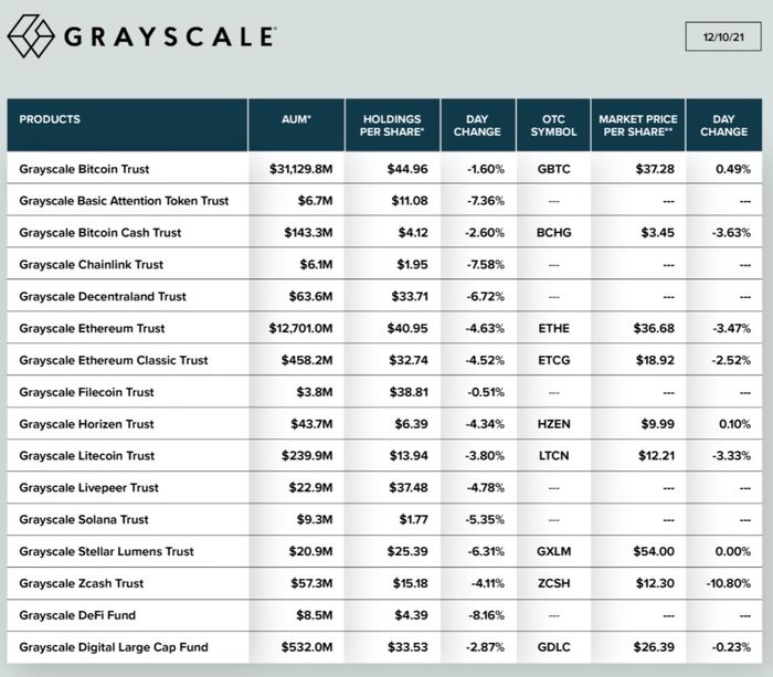 암호화폐 투자펀드 그레이스케일이 공식 트위터를 통해 12월 10일 기준 총 운용자산(AUM) 규모가 약 454억 달러를 기록했다고 밝혔다. 그레이스케일 비트코인 트러스트(GBTC) 판매 단위 가격은 전날 대비 0.49% 상승한 37.28 달러, 그레이스케일 이더리움신탁(ETHE)은 3.47% 하락한 36.68 달러에 거래되고 있다.