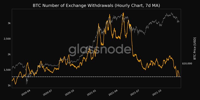 암호화폐 데이터 분석 업체 글라스노드에 따르면, 13일 기준 최근 7일간 암호화폐 거래소에서 출금된 평균 BTC 물량이 약 1,276.708 BTC를 기록하며 최근 21개월 래 최저 수치를 경신했다. 코인마켓캡 기준 BTC는 현재 1.62% 오른 50,114.28 달러에 거래되고 있다.
