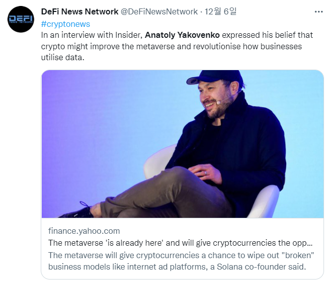 솔라나(SOL) 공동 창업자 아나톨리 야코벤코(Anatoly Yakovenko)가 12일 마켓인사이더와의 인터뷰에서 "NFT는 미래 소셜 네트워크의 초기 형태"라고 말했다. 이와 관련해 그는 "NFT는 자체적으로 수익을 창출하는 소셜 네트워크다. 구글이나 페이스북 등 플랫폼에 의존하지 않고 수익 창출을 위해 광고에 의존하지도 않는다. 이러한 외부적인 마켓플레이스에 대한 의존도 없이 자체 콘텐츠를 통해 수익을 창출할 수 있는 디지털 커뮤니티가 NFT"라고 설명했다.