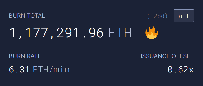 이더리움(ETH) 소각 관련 데이터 플랫폼 울트라사운드머니에 따르면, 런던 업그레이드 이후 이더리움 네트워크에서 누적 소각된 ETH 물량이 117.7만 ETH를 기록했다. 13일(현지시간) 현재 이더리움 네트워크의 분당 ETH 소각 속도는 약 6.31 ETH다. 코인마켓캡 기준 ETH는 현재 1.12% 내린 3,990.66 달러에 거래되고 있다.