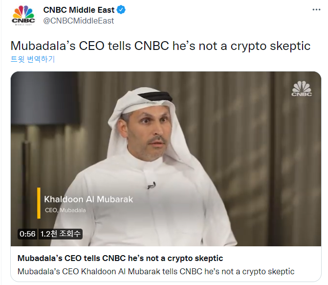 암호화폐 전문 미디어 유투데이에 따르면, 2,430억 달러 규모의 자산을 운용 중인 아랍에미리트(UAE) 국부펀드 무바달라 인베스트먼트캐피탈의 최고경영자(CEO)인 칼둔 알 무바라크가 최근 CNBC와의 인터뷰에서 "무바달라는 암호화폐 생태계에 투자하고 있다"고 밝혔다. 이와 관련해 그는 "무바달라는 블록체인 기술과 에너지를 최우선 관심 분야로 꼽고 있다"고 덧붙였다. 이어서 그는 "암호화폐와 블록체인 기술은 불과 몇 년 사이에 2,500억 달러 가치에서 3조 달러 가치로 급성장했다. 많은 사람들이 해당 산업을 회의적으로 보지만 난 이게 진짜라고 생각한다. 어느 시점에서 최종 형태의 규제환경이 마련되면 암호화폐는 진정한 자산 클래스로 인정받게 될 것"이라고 강조했다. 무바달라는 지난 2019년 UAE 최초 규제 적격 암호화폐 거래소 미드체인에 투자하며, 암호화폐 관련 사업에 첫 투자를 진행한 바 있다.