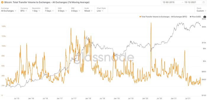 암호화폐 데이터 분석 업체 글라스노드에 따르면, 13일 기준 주요 암호화폐 거래소로 유입된 비트코인(BTC) 물량(최근 7일 평균치)이 2015년 4월 이래 최저 수준까지 감소한 것으로 나타났다. 거래소 유입 BTC 물량은 지난 12월 6일 4개월 최고치를 기록한 뒤 빠르게 감소하기 시작했다. 코인마켓캡 기준 BTC는 현재 5.79% 내린 47,028.20 달러에 거래되고 있다.