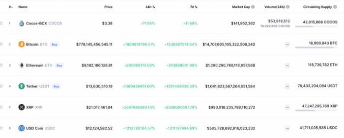 더블록에 따르면 암호화폐 마켓 데이터 플랫폼 코인마켓캡이 오늘 오전 발생한 버그로 인해 암호화폐 가격, 시가총액이 1시간 가량 잘못 표시된 것으로 나타났다. BTC는 개당 7890억 달러로, ETH는 91.8억 달러로 표시됐다. 버그는 현재 수정된 상태다. 운영팀은 오전 7시경(한국시간) 트위터를 통해 "현재 조사 중이며 더 많은 정보가 있을 시 이를 업데이트할 예정"이라고 전했다.