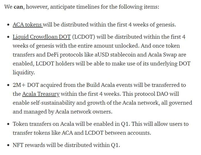 폴카닷(DOT) 기반 디파이 프로젝트 아칼라(ACA)가 14일(현지 시간) 공식 블로그를 통해 로드맵을 공개하며 "아칼라 네트워크의 자체 토큰 ACA는 제네시스 생성 첫 4주 내에 배포된다"고 밝혔다. 로드맵에 따르면, 아칼라의 리퀴드 크라우드론 DOT(LCDOT)는 락업이 전부 해제된 상태로 제네시스 생성 4주 내 유통될 예정이며, aUSD 스테이블코인, 아칼라 스왑과 같은 디파이 프로토콜이 활성화되면 LCDOT 보유자들은 기존 DOT 유동성을 활용할 수 있을 것으로 전망된다. 아칼라 네트워크 기반 토큰 전송은 1분기 활성화될 예정이며, 사용자는 ACA와 LCDOT와 같은 토큰을 계정 간에 전송할 수 있다. NFT 보상도 1분기 내 분배될 예정이다. 아칼라는 지난 11월 진행된 폴카닷 첫 파라체인 경매에 최종 낙찰받은 바 있다.