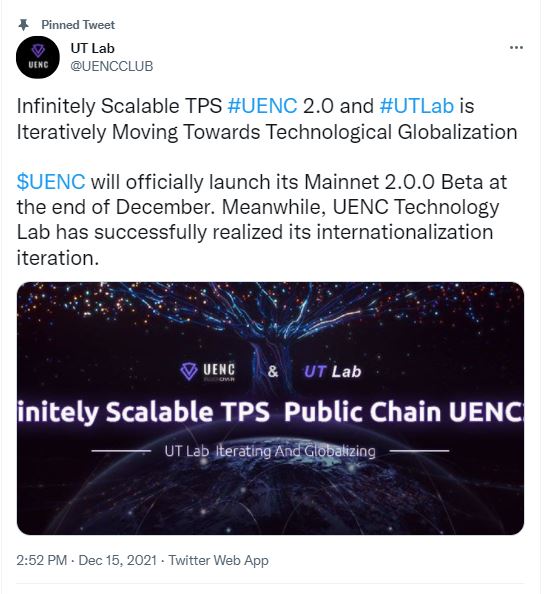 무한 확장 가능 블록체인 프로젝트 UENC 개발사 UT랩스가 공식 트위터를 통해 "12월 말 UENC 메인넷 2.0.0 베타 버전을 공식 출시할 예정"이라고 밝혔다. 이와 관련 UT랩스는 "메인넷 2.0 버전은 무한 확장성을 구현하기 위한 필수적 기반이며, 개발자들의 지난 4년 노력의 결실"이라고 설명했다.