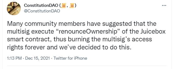 이더리움으로 자금을 조달해 소더비 미국 헌법 초판본 경매에 참여했으나 낙찰에 실패한 Constitution DAO(탈중앙자율조직)가 공식 트위터를 통해 다중서명으로 실행되는 주스박스(Juicebox) 스마트 컨트랙트의 소유권을 포기하며 이를 영구 소각한다고 밝혔다. 이와 관련 Constitution DAO 측은 "소유권 포기 절차에 따라 Constitution DAO 코어 팀 및 다중서명 서명자는 어떤식으로든 컨트랙트에 대한 권한이나 통제권을 가질 수 없다. 이는 주스박스의 자금과 토큰이 무기한으로 남아 존재하며, 절대 조작될 수 없음을 의미한다"고 설명했다. 또 이날 Constitution DAO 측은 미국 동부표준시 기준 12월 21일 20시 디스코드 서버를 종료하겠다고 덧붙였다. 앞서 지난 11월 미국 헌법 초판본 경매 낙찰에 실패한 Constitution DAO 코어팀은 프로젝트를 해체한다고 밝힌 바 있다.