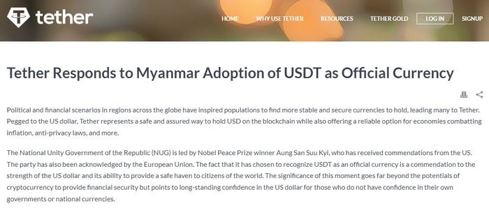 미얀마 반군부 진영이 테더(USDT)를 화폐로 공식 인정한 가운데, 테더가 "해당 소식은 미국 달러의 강세와 전세계 국민에게 안전한 피난처를 제공할 수 있는 USDT 능력에 대한 찬사"라고 전했다. 테더 측은 공식 블로그를 통해 "미얀마 군정에 대항하는 민주진영의 임시정부인 국민통합정부(NUG)는 EU의 인정은 받은 건 물론, 미국으로부터 표창을 받은 노벨 평화상 수상자인 아웅산 수치(Aung San Suu Kyi)가 이끌고 있다"며 "중요한 것은 많은 사람들이 자신의 정부 또는 국가통화에 확신이 없는 반면 미국 달러에는 오랜 확신이 있다는 것"이라고 설명했다. 이어 "전세계 정치 및 금융 시나리오 속에서 사람들은 더 안정적이며 안전한 통화를 찾아 테더로 향했다. 미국 달러에 고정된 USDT는 블록체인에 USD를 보유하는 안전하고도 확실한 방법이자 인플레이션에 대한 옵션"이라고 덧붙였다. 앞서 NUG는 "우리는 거래, 서비스, 결제 시스템을 용이하게 하도록 USDT를 공식 승인했다"고 밝힌 바 있다.