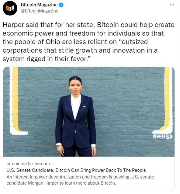 미국 오하이오 상원 후보인 모건 하퍼(Morgan Harper)가 비트코인 매거진(Bitcoin Magazine)과의 인터뷰에서 비트코인이 사람들에게 권력을 되돌릴 수 있다고 말했다. 그는 "권력 분산 및 자유에 대한 관심으로 비트코인에 대해 공부하기 시작했다. 소수의 사람 혹은 기업의 손에 권력을 집중 시키지 않고도 네트워크 효과의 이점을 누릴 수 있다는 것에 흥미를 느낀다"며 "비트코인이 개인을 위한 경제력과 자유를 창출해 오하이오 주민의 대기업 의존도를 낮출 수 있을 것"이라고 설명했다. 이어 "비트코인과 그 잠재력에 관심이 있지만 투자 편견 없이 일하기 위해 BTC를 보유하지 않고 있다. 개인의 재정적 이득이 아닌 오하이오 주민을 위해 해당 자산군에 대한 법을 제정하고 싶다"고 덧붙였다. 모건 하퍼는 상원 후보로 오는 2022년 5월 3일 민주당 예비선거에서 팀 라이언(Tim Ryan)과 겨루게 된다.