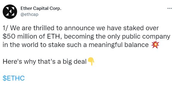 중국계 이더캐피탈(Ether Capital)이 공식 트위터를 통해 5000만 달러 이상의 ETH를 스테이킹했다고 발표했다. 이더캐피탈은 "세계에서 유일하게 ETH를 스테이킹하는 상장 기업으로서, 오늘의 스테이킹은 시작일 뿐이다"며 "2022년 합병 전 최소 30,000 ETH를 스테이킹할 계획이다. 현재 시가 기준 1.5억 달러 이상 규모"라고 전했다. 야후 파이낸스에 따르면 이더캐피탈은 현재 10,240 ETH를 이더리움 비콘체인(Beacon Chain)에 할당한 상태다.
