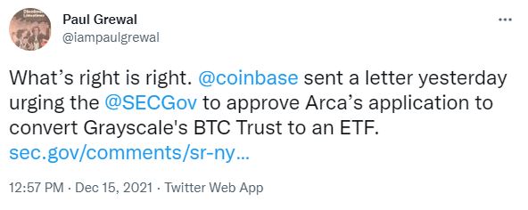 코인데스크에 따르면 코인베이스가 미국 증권거래위원회(SEC)에 서한을 발송, 그레이스케일 비트코인 트러스트(GBTC)의 현물 ETF 전환 신청 승인을 촉구했다. 코인베이스는 "투자자들이 ETP 형식으로 GBTC에 투자할 수 있어야 한다고 생각한다. 그것은 개인 투자자들이 비트코인 현물 보유 대신 비트코인에 투자할 수 있는 검증된 방법이다"고 전했다. 코인베이스 최고법률책임자 폴 그레월(Paul Grewal)은 자신의 트위터를 통해 "옳은 것이 옳은 것"이라며 "현물 기반 ETP는 허용하지 않은 상태로 선물 기반 ETP만 허용할 합리적인 근거는 없다. 두 상품 모두 비트코인 가격을 따른다"고 말했다. 지난 10월 19일 그레이스케일은 GBTC의 현물 비트코인 ETF 전환을 위해 관련 신청서를 제출했다. SEC는 이르면 12월 24일 승인 여부를 결정할 예정이다.