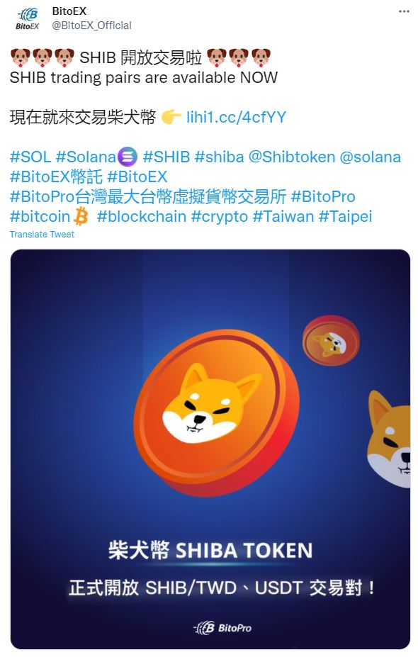 유투데이에 따르면 대만 암호화폐 거래소 비토엑스(BitoEX)가 시바이누(SHIB, 시총 13위)를 상장했다. SHIB 입출금은 이미 오픈된 상태다. 비토엑스는 2014년 설립된 대만 대표 암호화폐 거래소다. 코인마켓캡 기준 SHIB은 현재 1.94% 오른 0.00003376 달러에 거래되고 있다.